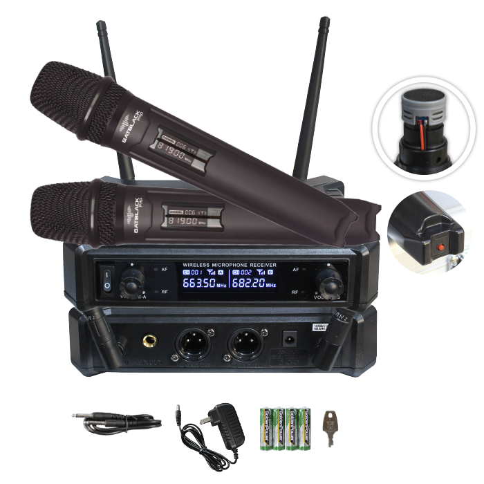 • Frecuencia: UFH 660-690 MHz • Estabilización de Frecuencia: calibración automática • Rango dinámico: >90dB • Distorsión Armónica: < 0.4% • Frecuencia de rspta.: 40Hz-15KHz ± 3dB • Nivel de salida de audio: Balanceada 400mV Desbalanceada 400mV • 1 cable plug, 1 adaptador 12V 0.5A, 4 pilas AA, 1 llave y 1 maletín • Base 20.5 x 4.5 x 14.2 cm • 5 x Cj.