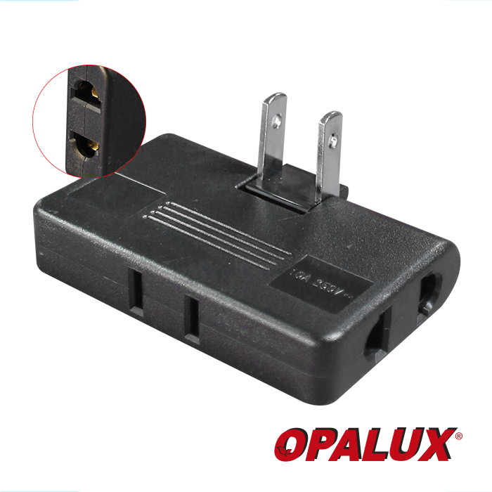 ADAPTADOR TOMA TRIPLE ENCHUFE GIRATORIO PLANO "OPALUX" 2JACK UNIV.1JACK DE COLOR NEGRO 10AMP 250V AC(2P). BOLSAX50. MASTERX300