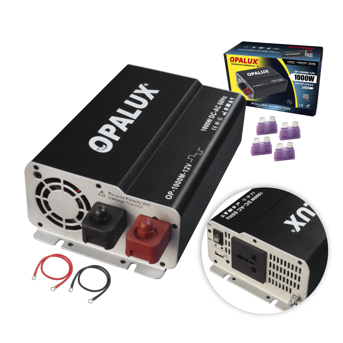 • Material: Aluminio • Voltaje de entrada: 12V DC • Voltaje de salida: 220VAC • Potencia nominal: 1000W • Potencia de sobretensión: 2000W • USB: 5V DC • LED: verde / rojo • Medidas: 25x15x8cm • Forma de onda: Onda Senoidal modificada • Tipo: Inversores DC/AC • Frecuencia de salida: 50/60Hz • Certificado: CE - ROSH • Tamaño: Inteligente, ligero y compatible, menos ruido y sin contaminación • 6 x Cj.