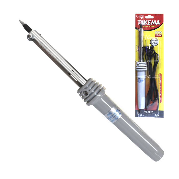 CAUTIN T/LAPIZ "TAKEMA" 60W 220V CON ESPIGA PLANA, MANGO DE PVC GRIS PUNTA PLATA BLISTER CJX100