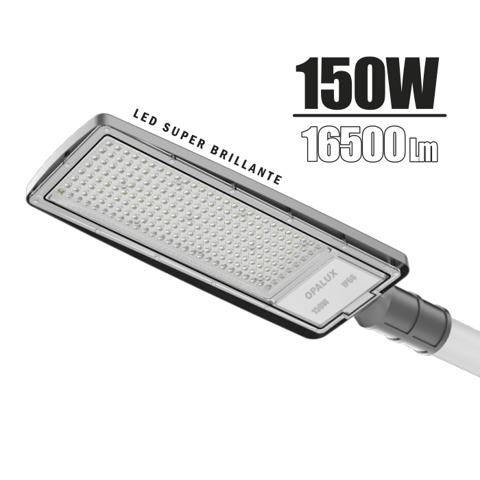 Luminaria LED para Alumbrado Público • Potencia: 150W • Rango de Voltaje: 100-265V • LED SMD: 216 • Lúmenes: 16500Lm • Ángulo de proyección: 75 x 152º • Medidas: 58x22.5x6.6cm